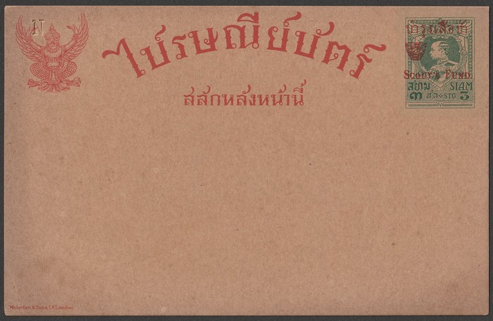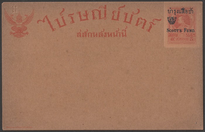 Fund opt on Rama VI Postcard 5s red. VF UN, evenly tropicalised as usual. Extremely rare with only tiny number recorded & owner originally paid $1570. Certificate can be obtained on request. (P) (Image1) (Image2)