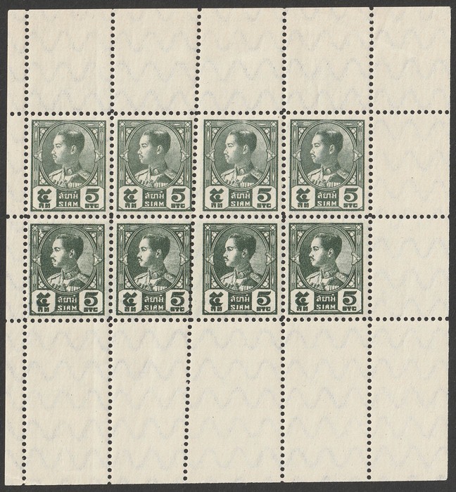 selection inc 1939 National Day Survey Dept Essays, imperf blks of 4 w/o value in green (3s), orange (10s), blue (15s), & violet, plus violet UR cnr marginal blk in blue, perf. Also 1943 Rama VIII Survey Dept essay die proof in grey w/o value, opt