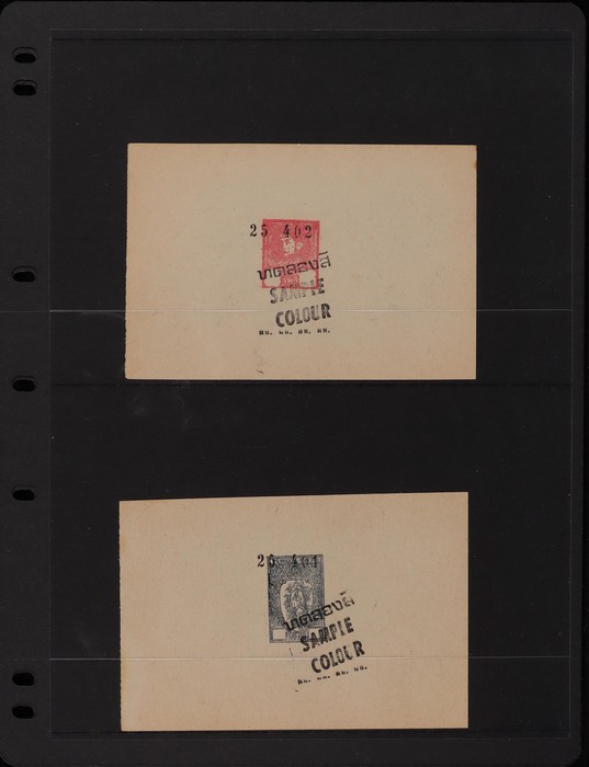 '25 401 sample colour', 1941 Rama VIII essay die proof in red w/o value, opt '25 402 sample colour' & Thai Occup of Malaya 1944 War Memorial Survey Dept essay w/o value in purple, opt SAMPLE COLOUR. VF UN as made, all 4 margins. Some of these are