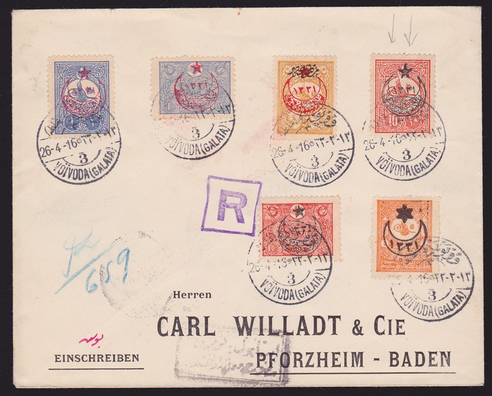 cover franked star & crescent opts (6) on 1901 2Pi & 5pa printed matter, 1909 1Pi & 10Pi & 1913 GPO 1Pi & 10Pi, tied by 'Voivoda (Galata) 26 4 16' cds. To Germany with 'Pforzheim' arrival b/s. SG 544, 645-6, 651-2 & 659. Mi 271, 364, 371-2 & 376-7