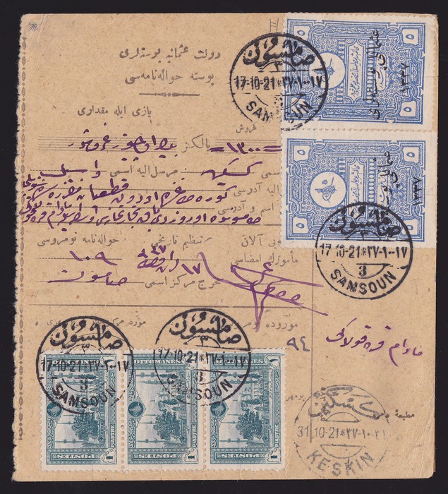 franked Nationalist Govt 'Osmanli Postalari 1337' opt Religious Tribunal fiscal 5Pi (10) -cut as per PO rules, tied by 'Samsoun 12 10 21' cds, with Keskin arrival b/s. Mi 730, SG A39 cat £4750 as loose stamps alone!! -worth several times more