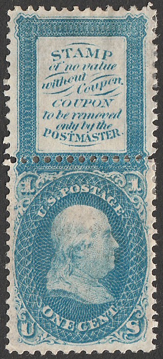 blue, Bowlsby Coupon Essay, plate proof on white paper, perf. Superb fresh M, gummed only on stamp. Sc 63-E13h cat US$300 & under-catalogued. Very rare. (P) (Image1)