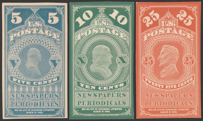 Periodical set 5c-25c with 5c blue white border, 10c green & 25c orange National Bank Note Co printing, plate proofs on thin card, imperf, in issued colours. VF UN as made, 5c small thin, all 4 margins. SG N75-77(p), cat £1450 as normals. Sc