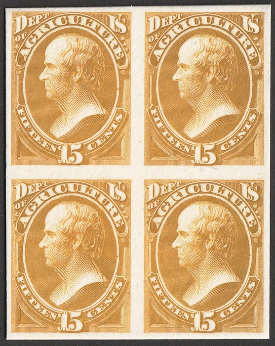 Agriculture 15c yellow blk of 4, plate proofs on card, imperf, in issued colour. Superb UN made, all 4 margins. SG O186(p) cat £1700 as normals. Sc O7P4 cat US$50++ (normal cat US$1700). Scarce multiple. (4). (Image1)