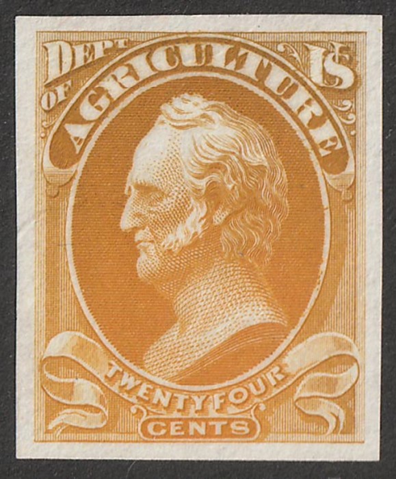 Agriculture 24c yellow plate proof on India paper, imperf, in issued colour. Superb UN as made, all 4 margins. SG O187(p) cat £425 as normal. Sc08P3 cat US$20 (normal cat US$425). (Image1)