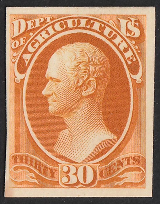 Agriculture 30c yellow plate proofs on card, imperf, in issued colour. VF UN as made, 4 margins. SG O188(p) cat £550 as normal. Sc O9PU cat US$10 (normal cat US$550).