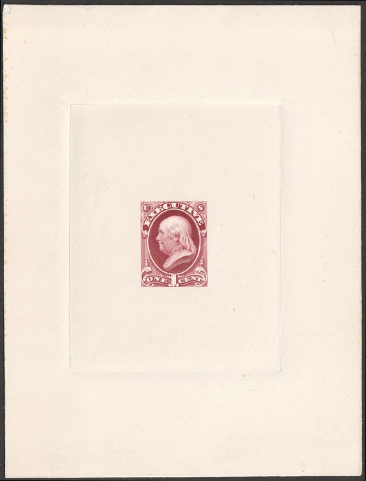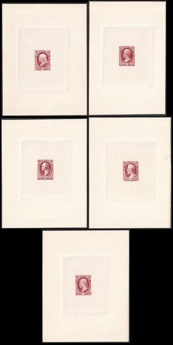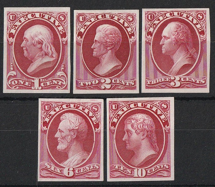 Executive set 1c-10c carmine plate proofs on card, imperf in issued colours. VF UN as made, all 4 margins. SG O189-193(p) cat £3750 as normals. Sc O10-14P4 cat US$50+ (normals cat US$4275). (5). (P) (Image1)
