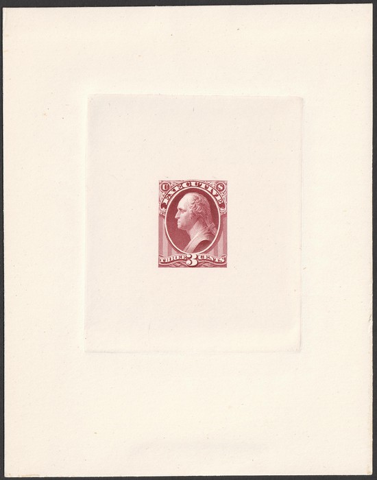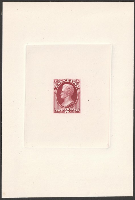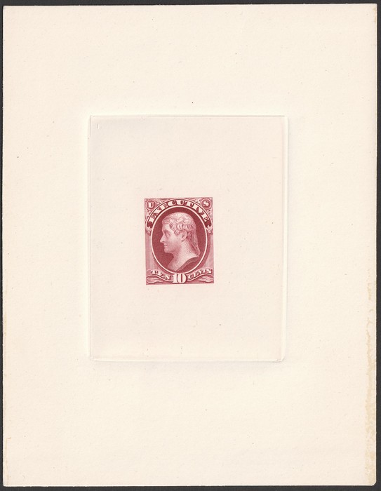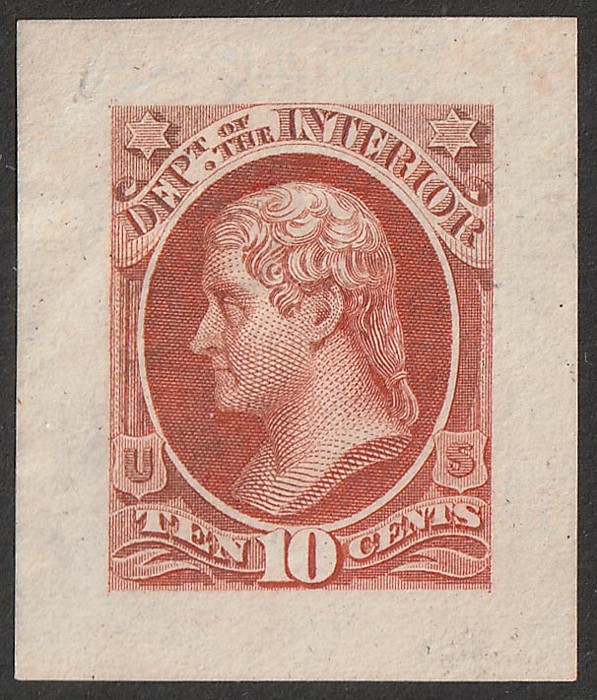 Interior 10c vermilion DIE PROOF on India paper, imperf in issued colour. VF UN as made, reduced margins but still 4 large margins. SG O198(p) cat £70 as normal. Sc O19P1 cat US$80 (normal cat US$70). (Image1)