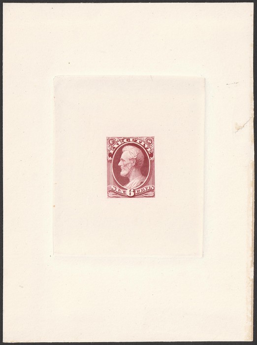 Interior 6c black, trial colour proof on thin card, instead of vermilion issued colour, for Atlanta Exhibition. Superb UN as made, 4 margins. SG 197(p) cat £70 as normal. Sc O18TC4a cat US$55 (normal cat US$70. (Image1)