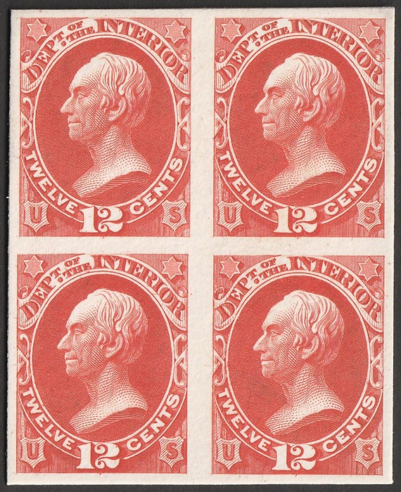 Interior 12c vermilion blk of 4, plate proofs on card, imperf, in issued colour. Superb UN as made, all 4 margins. SG O199(p) cat £360 as normals. Sc O20P4 cat US$50+ (normals cat US$360). Scarce multiple (4). (Image1)