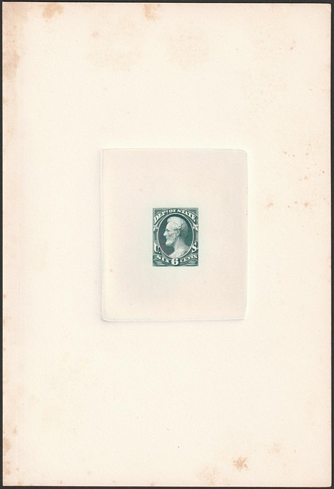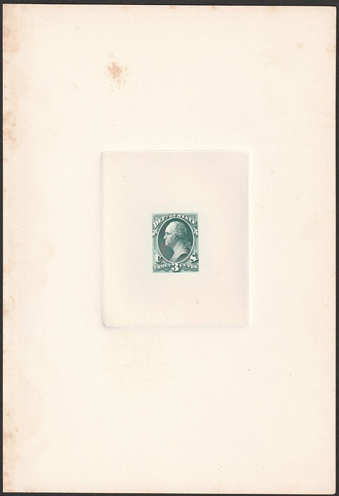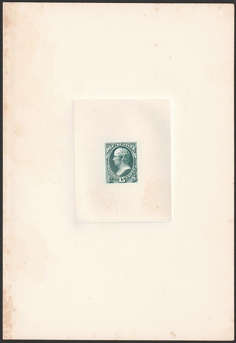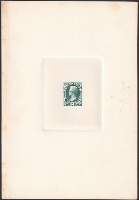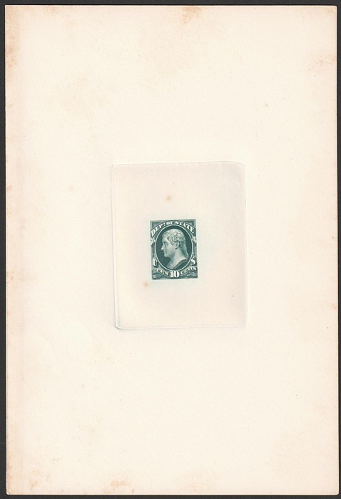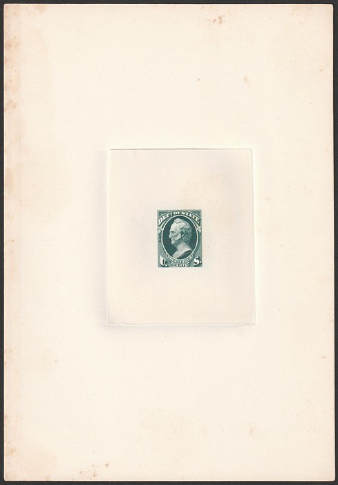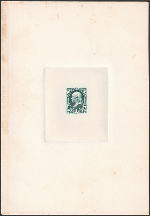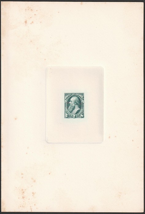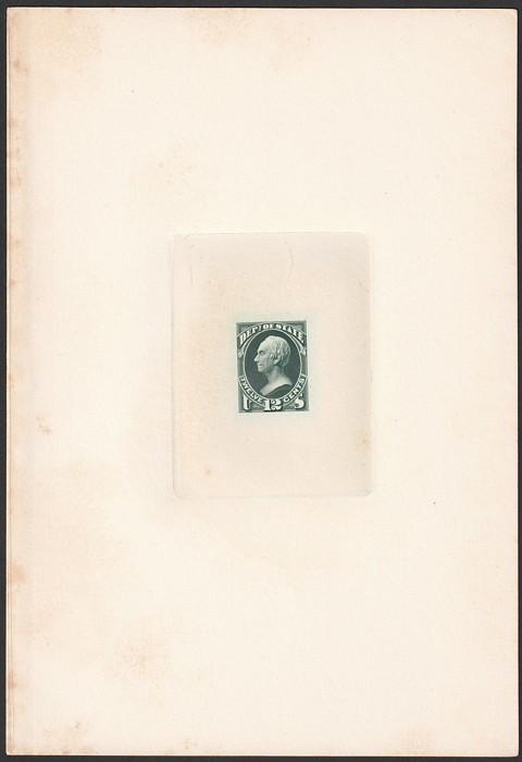 of State 24c green, plate proof on card, imperf, in issued colour. VF UN as made, 4 margins. SG O243(p) cat £550 as normal. Sc O65P4 cat US$10 (normal cat US$550).