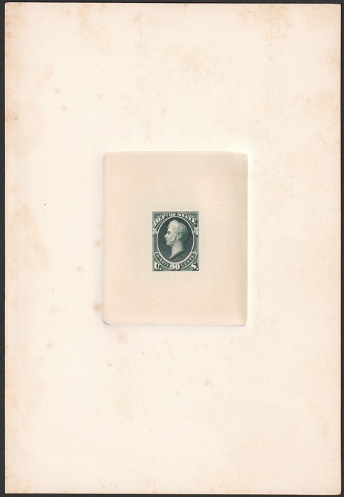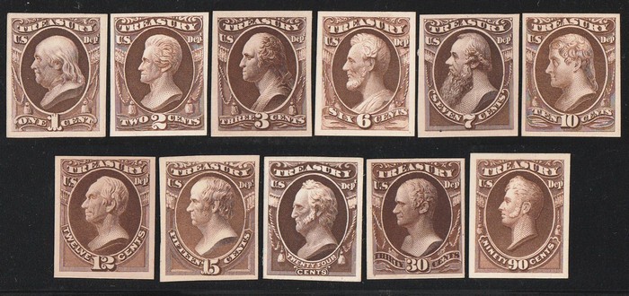 Treasury Dept set 1c-90c brown LARGE DIE PROOFS on India paper (mostly about 62x75mm), removed from card. Mostly VF fresh UN as made. SG O250-60(p), (normal cat £2750). Sc O72-82P1 cat US$880 (normal US$3115). Rare & attractive (11) (P) (Image1) (Image2)