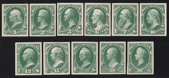 1c-90c green, plate proofs on card, imperf in issued colours. Superb UN as made, all 4 margins. SG O235-O245(p) cat £4300 as normals. Sc O57P4-O67P4 cat US$110+ (normals cat US$4415). (11) (P) (Image1)