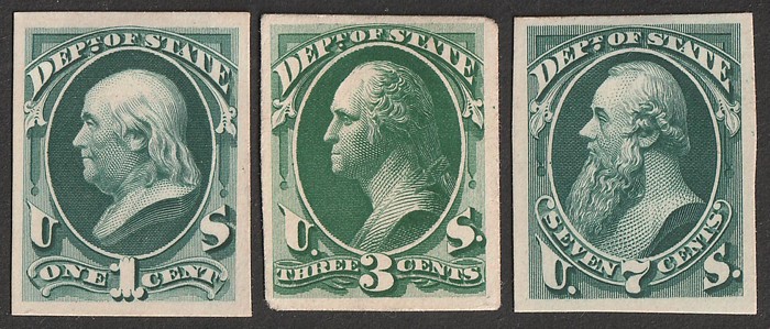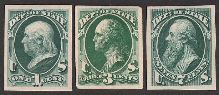 of State 1c, 3c & 7c green, plate proofs on card, imperf, in issued colour. VF UN as made, all 4 margins. SG O235, 0237 & 0239(p) cat £775 as normal. Sc O57P4, 059P4 & 061P4 cat US$30 (normal cat US$770). (3). (Image1)