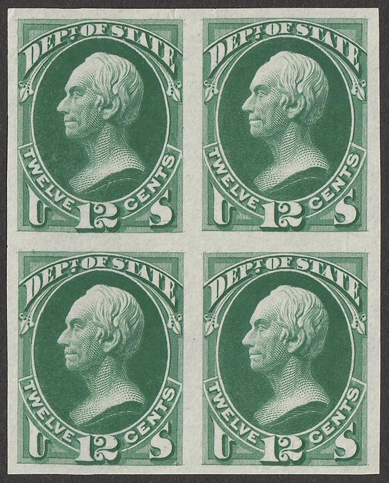 of State 12c green, blk of 4, plate proofs on India paper, imperf, in issued colour. Superb UN as made, all 4 margins. SG O241(p) cat £1200 as normals. Sc O63P3 cat US$100+ (normal cat US$1240). Rare multiple. (4) (P) (Image1)
