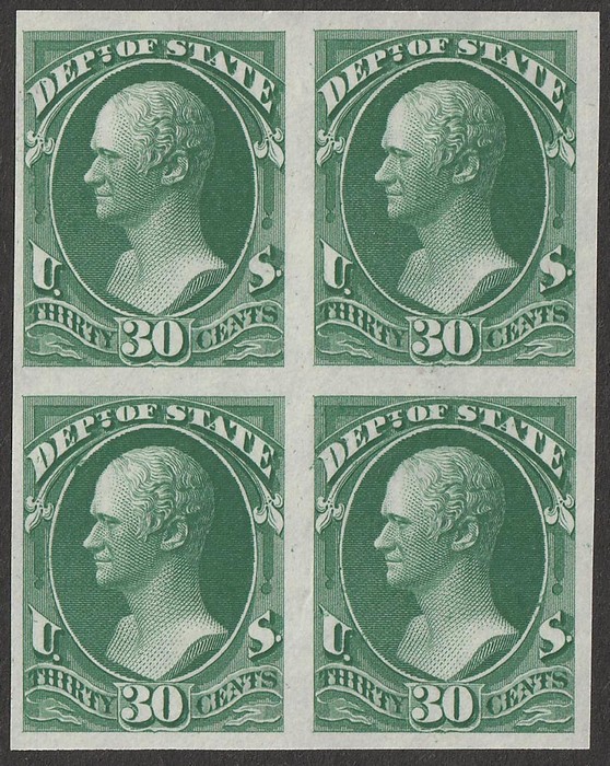 of State 30c green, blk of 4, plate proofs on India paper, imperf, in issued colour. Superb UN as made, all 4 margins. SG O244(p) cat £2000 as normals. Sc O66P3 cat US$100+ (normal cat US$2100). Rare multiple. (4) (P) (Image1)
