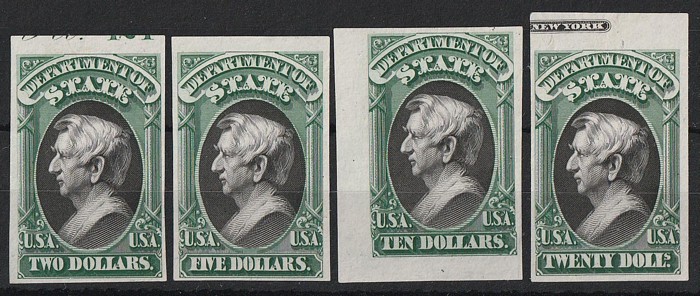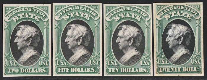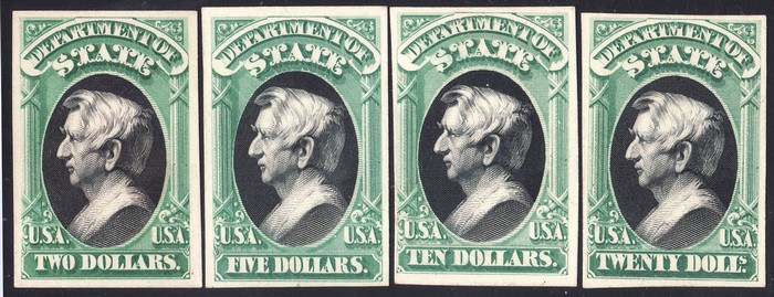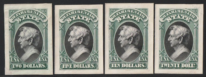 of State $2-$20 green & black plate proofs on card, imperf, in issued colours. Superb UN as made, all 4 margins. SG O246-O249(p) cat £20,100 as normals. Sc O68Pu-O71PU cat US$140 (normals cat US$19,300). (4). (P) (Image1)