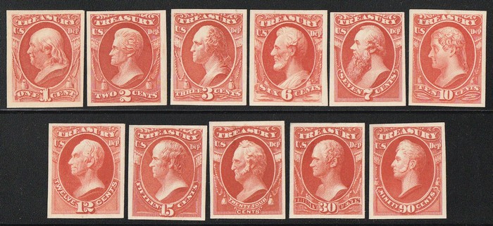 Treasury set 1c-90c scarlet, trial colour proofs on thin card, imperf, instead of brown issued colour, for Atlanta Exhibition. Superb UN as made, all 4 margins. SG O250-O260(p) cat £2750 as normals. Sc O72TC4b-O82Tc4b cat US$407 (normals cat
