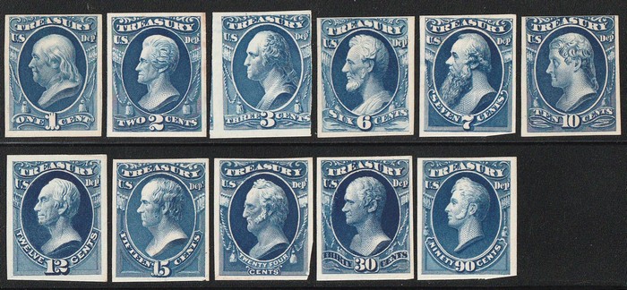 Treasury set 1c-90c blue, trial colour proofs on thin card, imperf, instead of brown issued colour, for Atlanta Exhibition. F-VF UN as made, most 4 margins. SG O250-O260(p) cat £2750 as normals. Sc O72TC4e-O82Tc4e cat US$407 (normals cat