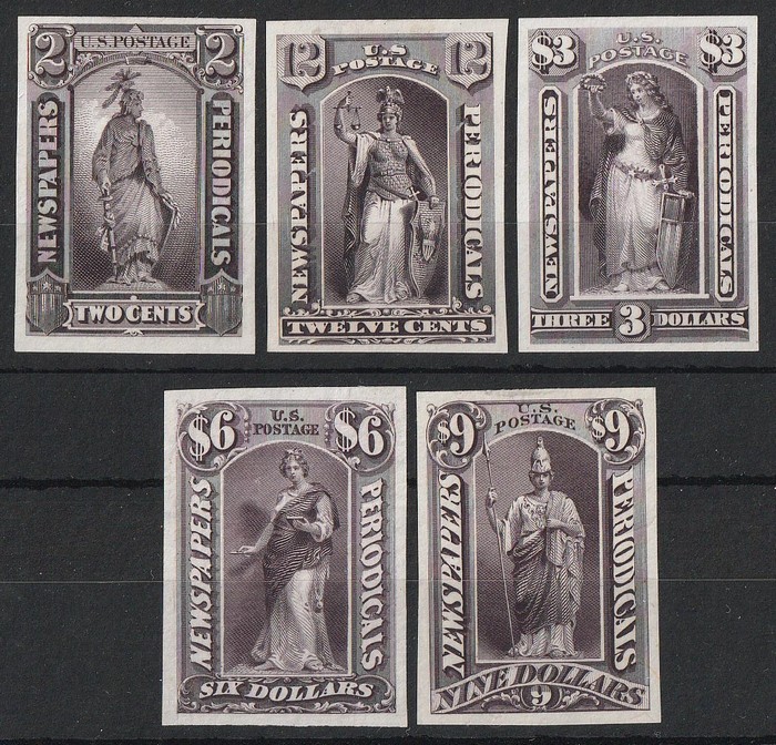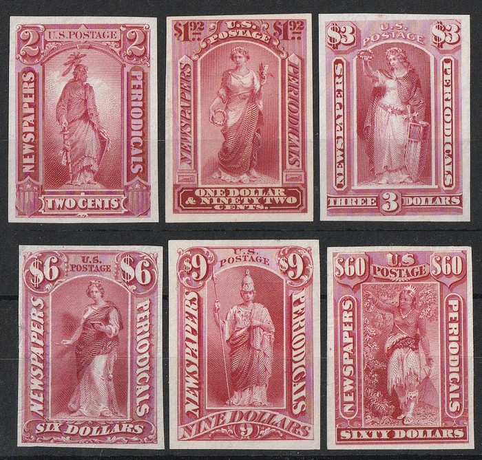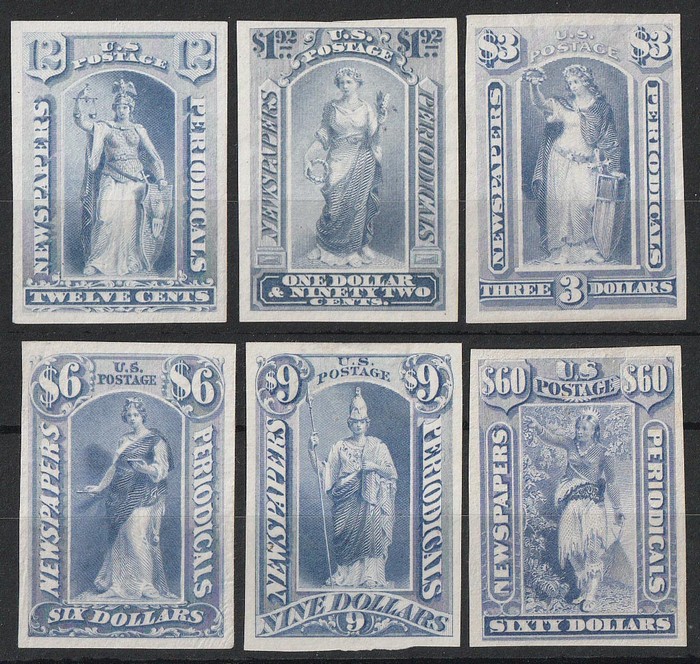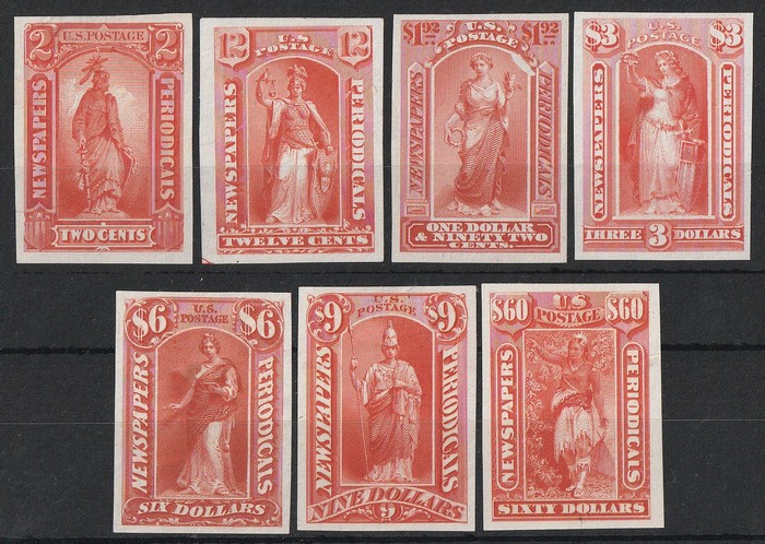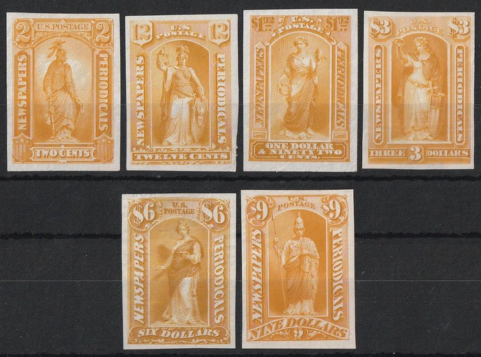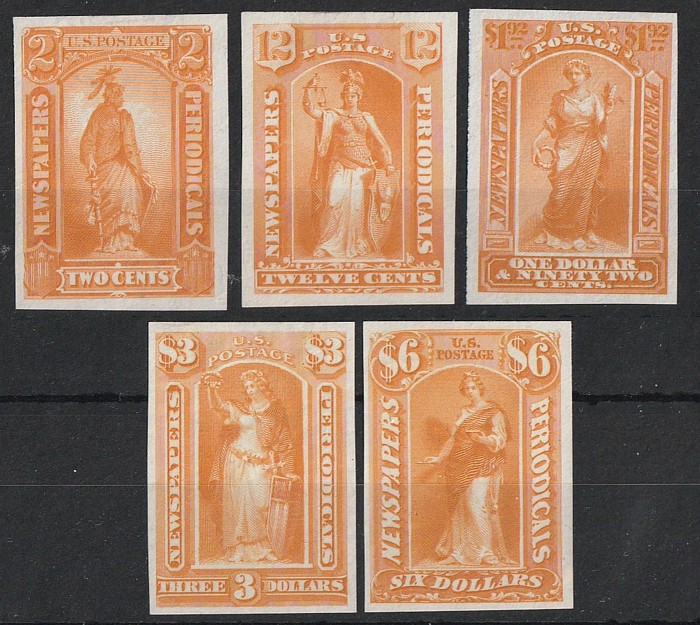 Periodical 2c, 12c, $1.92, $3 & $6 dull orange, trial colour plate proofs on India paper, imperf, instead of various issued colours. Superb UN as made, all 4 margins. SG ex N180-97(p) cat £8075 as normals. Sc ex PR9TC3g-PR26TC3h cat US$175