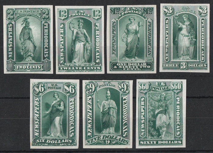 Periodical 2c-10c black, Continental Bank Note Co printing, plate proofs on card, imperf, in issued colours. Superb UN as made, 4 margins. SG N180-86(p) cat £2250 as normals. Sc PR9P4-PR15P4 cat US$84 (normals cat US$2725). (7). (Image1)