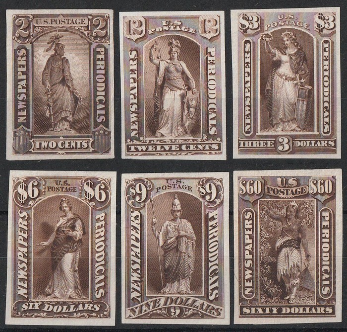 Periodical set 2c-$60 sepia, trial colour plate proofs on India paper, instead of various issued colours. Superb UN as made, all 4 margins. SG ex N180-N203(p) cat £17,775 as normals. Sc PR9TC3e-PR32TC3d cat US$210 (normals cat US$20,850). (6)