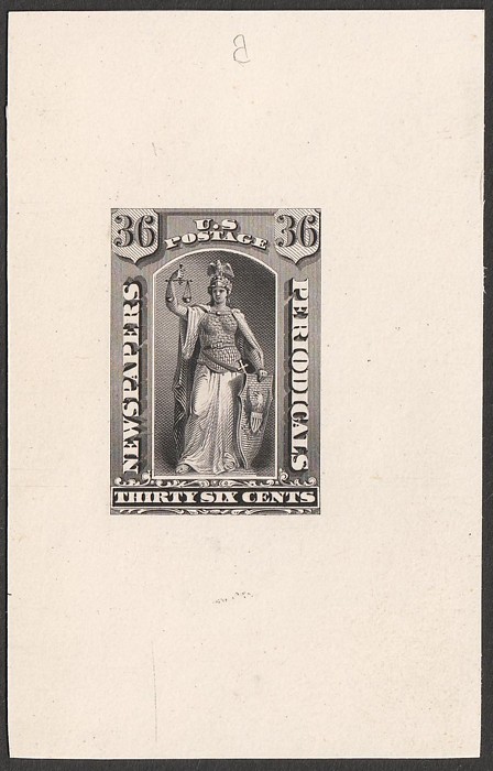 Periodical 36c black, trial colour DIE PROOF on card (55 x 86mm), imperf, instead of rose issued colour. Superb UN as made, 4 margins. SG N189(p) cat £850 as normal. Sc PR18TC1af(var) cat US$600 plus premium for rare unlisted variety printed