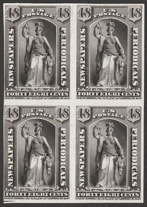 Periodical 48c black blk of 4, plate proofs on India paper, imperf, instead of rose issued colour. VF UN as made, all 4 margins. SG N190(p) cat £5200 as normals. Sc PR9TC3a cat US$140+ (normals cat US$5000). Rare multiple. (4) (P) (Image1)