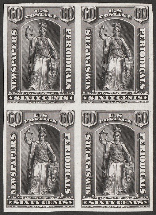 Periodical 60c black blk of 4, plate proofs on India paper, imperf, instead of rose issued colour. Superb UN as made, all 4 margins. SG N191(p) cat £5200 as normals. Sc PR20TC3a cat US$140+ (normals cat US$6000). Rare multiple. (4) (P) (Image1)