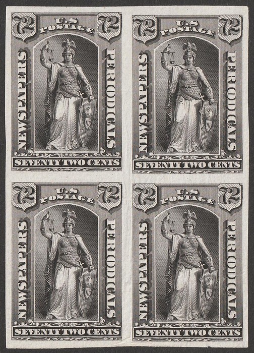 Periodical 72c black blk of 4, plate proofs on India paper, imperf, instead of rose issued colour. Superb UN as made, all 4 margins. SG N192(p) cat £5600 as normals. Sc PR21TC3a cat US$140+ (normals cat US$6000). Rare multiple. (4) (P) (Image1)