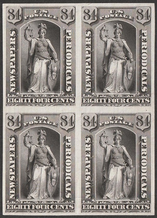 Periodical 84c black blk of 4, plate proofs on India paper, imperf instead of rose issued colour. Superb UN as made, all 4 margins. SG N193(p) cat £7600 as normals. Sc PR22TC3a cat US$140+ (normals cat US$7400). Rare multiple. (P) (Image1)
