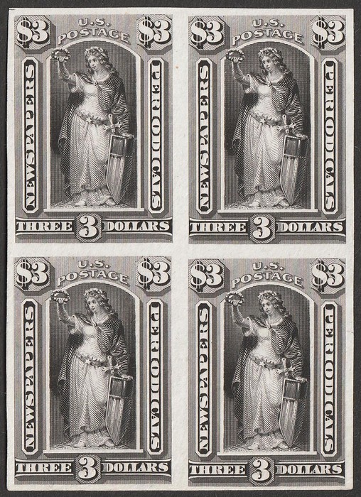 Periodical $3 black blk of 4, plate proofs on India paper, imperf instead of vermilion issued colour. Superb UN as made, all 4 margins. SG N196(p) cat £7200 as normals. Sc PR25TC3a cat US$140+ (normals cat US$10,000). Rare multiple. (4) (P) (Image1)