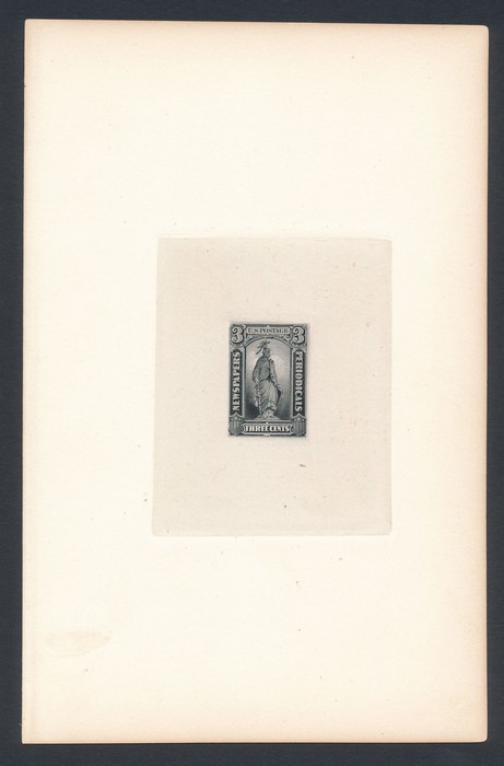 Periodical 3c black, large DIE PROOF on India paper on card (145x225mm), imperf, in issued colour. VF UN as made, 4 margins. SG N181(p) cat £275 as normal. Sc PR10P1 cat US$100 (normal cat US$350). (Image1)
