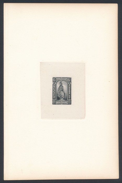 Periodical 6c black, large DIE PROOF on India paper on card (146x226mm), imperf, in issued colour. Superb UN as made, 4 margins. SG N183(p) cat £275 as normal. Sc PR12P1 cat US$100+ (normal cat US$350). (Image1)