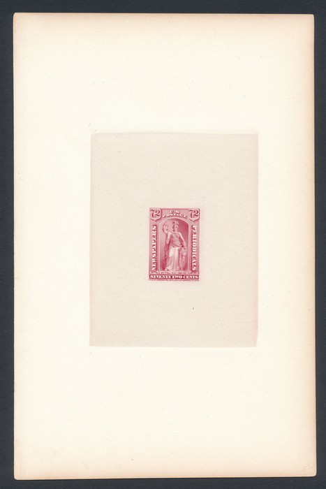 Periodical 72c rose, large DIE PROOF on India paper on card (145x225mm), imperf, in issued colour. Superb UN as made, 4 margins. SG N192(p) cat £1400 as normal. Sc PR21P1 cat US$100 (normal cat US$1500). (Image1)