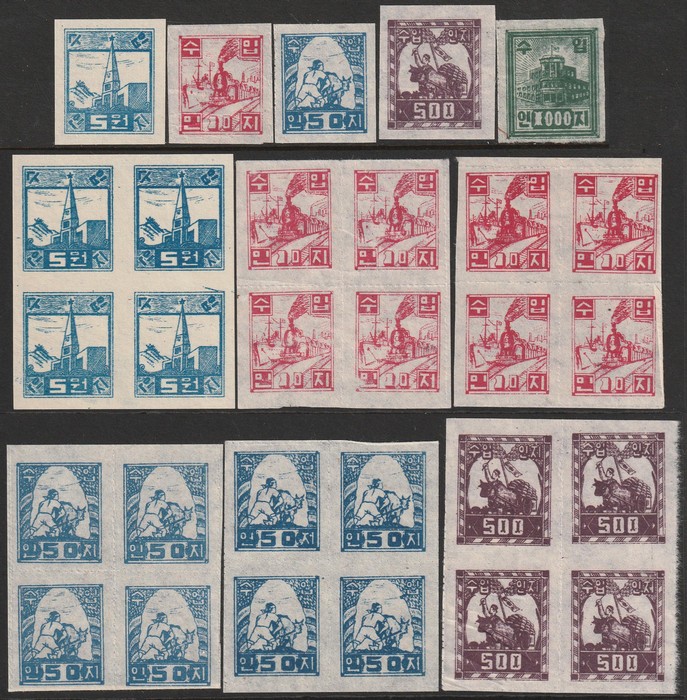 891 imageKorea: 1950 Korean War revenues 5w blue, 10w red, 50w blue, 500w maroon & 1000w green, 5w imperf on normal paper, others roul on rice paper, plus 6 diff blks of 4 inc shades. VF UN as issued. Bft ex3-9. Prepared for use in communist occupied areas of South Korea & rather scarce. (29) (Image1)