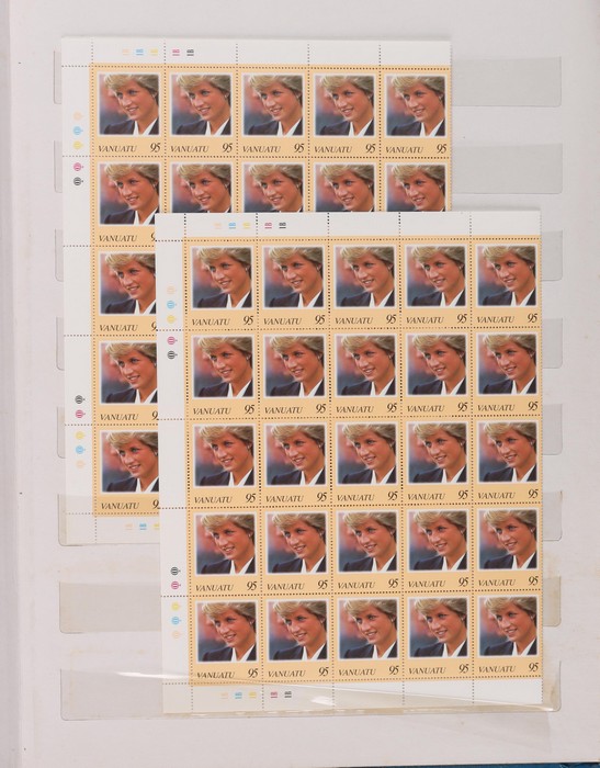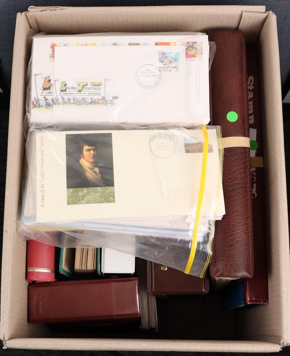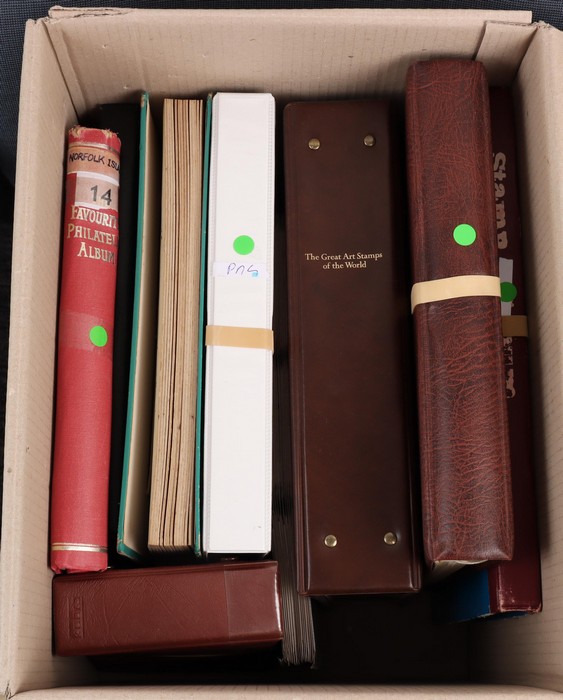 892 imageLarge carton inc Great Art Stamps of the World with 108 FDC 1978-81 inc comp sets in 'International Council of Museums Foundation' custom album (original cost ca.$500. Then more FDC with 150 Australian/AAT 1980s-90s Pic/Commem sets & odd M/sheet in 2 bags, plus EXPO 88 set in folder. Then stamps with Australia 1920s-60s M/MNH collection in black s/book, Africa Pics/Commems/Thematics in thick blue s/book, plus Tokelau $1 & Vanuatu 95c 1997 Diana Memorials, 100 of ea in MNH sheets of 50 FV A$180+. Jersey collection to 1987 in KABE hingeless album with 60 MNH Pic/Commem sets inc 1969 Defs to £1, other QEII to £5, plus 1941/43 Pics set of 8 to 3d (total SG cat £140). Norfolk Is near comp to 1974 UPU M/sheet in springback album inc 1947 Ball Bay to 2/- blue, 1953 Defs to 5/- brown Bridge, 1960 Local Govt 2/8 & Defs set to 10/- Bird, 1966 opt set, 1967 Ships, 1969 Birds to $1 & most other Pic/Commem sets (160, retail $240). PNG 1952-85 collection inc 1952 Defs to £1 Fisherman, 1963 Pics to £1 QEII, 1964 Birds to 10/-, 1966 Butterflies to $2 & 110 other Pic/Commem sets, mixed M/MNH/U. Also 1973 RW & 1974 Churchill British Commonwealth Omnibus MNH collections. (Image1) (Image2) (Image3) (Image4) (Image5) (Image6) (Image7) (Image8) (Image9) (Image10) (Image11) (Image12) (Image13) (Image14) (Image15) (Image16) (Image17) (Image18) (Image19) (Image20) (Image21) (Image22) (Image23) (Image24) (Image25) (Image26) (Image27) (Image28) (Image29) (Image30) (Image31)