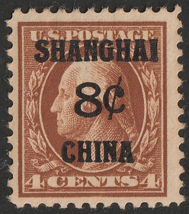 'SHANGHAI 8c CHINA' opt Washington 4c brown. VF fresh M. Scott K4 cat US$55. SG 4 cat £75. (Image1)