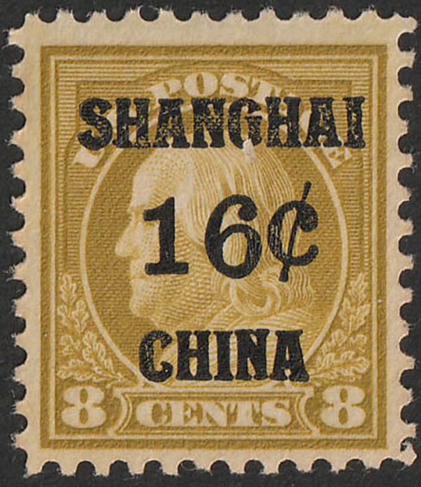 'SHANGHAI 16c CHINA' opt Franklin 8c olive-bistre. VF fresh M. Scott K8 cat US$55. SG 8 cat £75. (Image1)