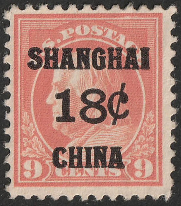 'SHANGHAI 18c CHINA' opt Franklin 9c salmon-red. VF fresh MLH. Scott K9 cat US$60. SG 9 cat £80. (Image1)