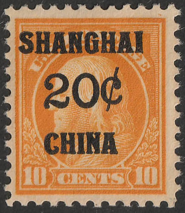 'SHANGHAI 20c CHINA' opt Franklin 10c orange-yellow. VF fresh M. Scott K10 cat US$55. SG 10 cat £75. (Image1)