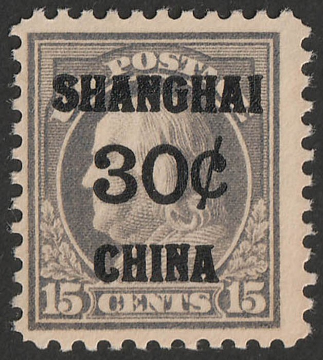 'SHANGHAI 30c CHINA' opt Franklin 15c grey. VF fresh MLH. Scott K12 cat US$83. SG 12 cat £120. (Image1)