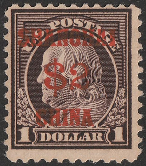 'SHANGHAI $2 CHINA' opt Franklin $1 violet brown. VF fresh M. Scott K16 cat US$425. SG 16 cat £550. (P) (Image1)