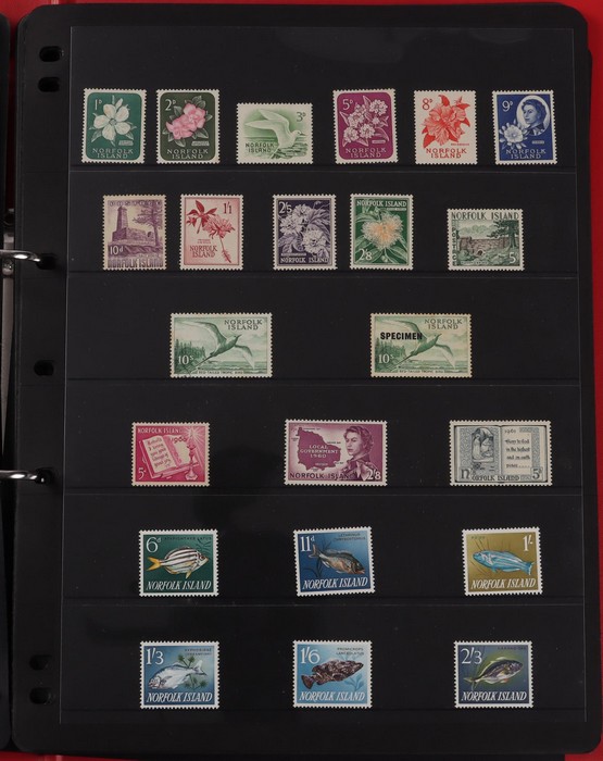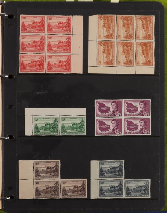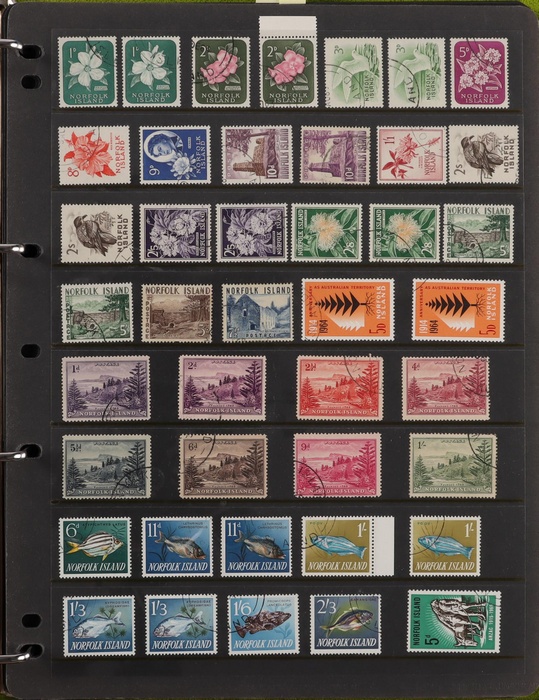 908 Mixed World carton lot Seven: Aitutaki - USA in six 1950s loose leaf albums inc Australia to 1970, Asia with Hong Kong, Japan, Thailand & others, GB 1890s QV to 5/- rose, NZ 1960s Pics to £1 or £2 Geyser, plus other Pacific Islands, then Africa, Europe, Middle East & South America. Then single country collection with Australia 1914-65 in Seven Seas hingeless album with KGV to 1/4 inc OS opts to 5d, 1930s Commem sets inc 1935 ANZAC 1/- & KGV SJ to 2/-, 1937 KGVI Robes to £1 & 1949 Arms to £2 all G-FU. Christmas Is 1980s-90s MNH accumulation (FV $360) inc M/Sheets, imprint blks, plate number blks & other multiples inc vals to $4 Birds. Great Britain 1890s QV to 1990s QEII Machins accumulation & Italy similar era mess in separate VGC Lighthouse 32 black pg s/books (retail $110). Norfolk Is 1940s-80s M/MNH accumulation in 35 hagners inc Ball Bay to 2/-, 1953 Pics to 5/- brown Bridge, 1966 opt set MNH to $1 Bird (6 sets) plus extras, 1967 Ships sets (10), 1970 Birds sets (6), 1974 UPU M/Sheets (3). All mixed M/MNH/G-F/VFU with 12 albums in total. Housed in large carton. (1000s)
