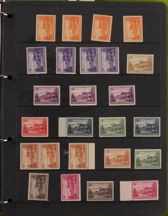909 Mixed World carton lot Eight: Australia KGV accumulation (900) in 25 hagners with vals to 3d, 4d or 5d. Then another 45 hagners with 1938 Robes 5/- (8), 10/- pr & £1 (5), all with telegraph holes to 5/- Arms inc many blks & multiples. G-FU plus empty 1913-65 Seven Seas hingeless pgs (retail $160) inc BCOF opts, perf OS, Postage Dues & Specimen opts. Christmas Is 1958-93 MNH collection in Seven Seas hingeless album (retail $700) inc 1958 QEII, 1968 Fish, 1982 Birds to $4 & 1987 Wildlife to $5. France duplicated mostly Defs accumulation in 50 hagners. East Germany 1950s-80s duplicated collection (100s) in near new Lighthouse 32 black pg s/book. Norfolk Is 1947-80 M/MNH collection in Seven Seas hingeless album (retail $550) inc Ball Bay to 2/- blue, 1953 Def set to 5/- brown Bridge, 1960 Pics to 10/- Bird inc extra 10/- opt SPECIMEN, 1966 opts, 1969 Birds, 1974 UPU M/Sheet & 1980 Aircraft to $5. USA 1940s-90s accumulation in hagners & 2 s/books inc MNH Pics & M/Sheets (FV $50 = A$75) plus 100s of G-FU stamps. Ten albums in total, mixed MNH/M/G-F/VFU. Housed in large carton. (Few 1000)