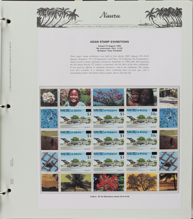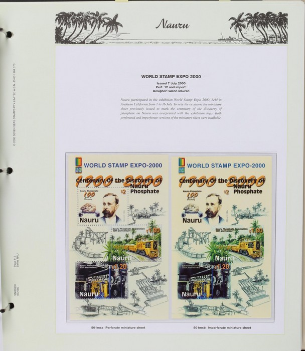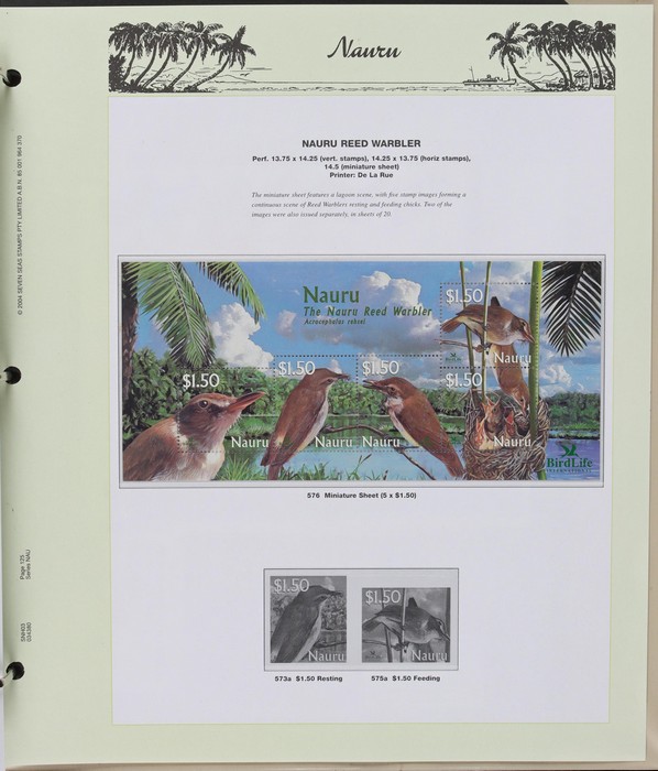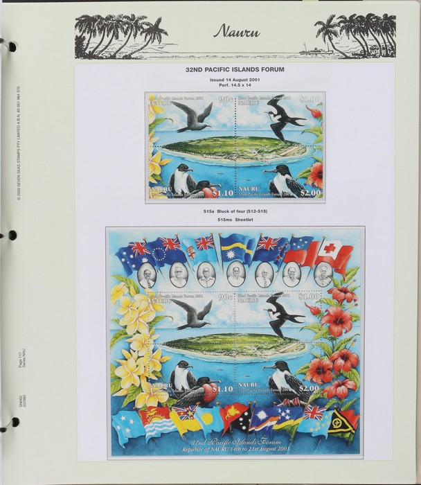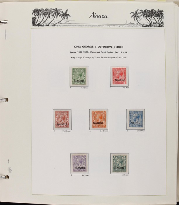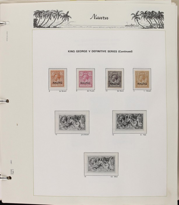 913 imageNauru: 1916-2002 virtually comp M/MNH collection in Seven Seas hingeless album (retail $300) inc 1916 opt set to KGV 1/-, 1924 Ships to 10/- VFM (10/- MNH), 1950s/60s Pics to 5/- 1968-2002 decimals MNH with 105 Pic/Commem sets plus 45 M/sheets inc 1974 UPU, 1995 Exhibitions, 2000 World Expo imprint & 2002 Birdlife. Plus high cost of album. (Image1) (Image2) (Image3) (Image4) (Image5) (Image6) (Image7)