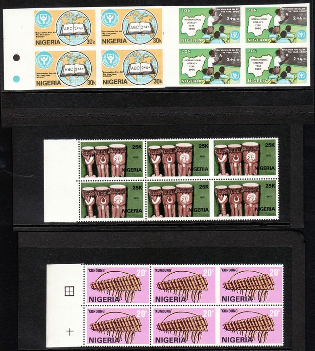 926 imageNigeria: 1989-90 MNH Errors & varieties selection inc 1989 Musical Instruments 20K, 25K & 30K blks of 6, error IMPERF vert BETWEEN 4 stamps, plus 10k control blk of 6, variety printing shifted upwards & black ink smudged. Also 1990 Literacy Year set in imperf blks of 4. VF fresh M. SG 572-75, 593-94(var). (6 blks). (Image1) (Image2)