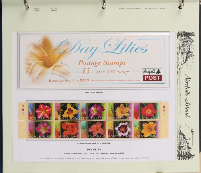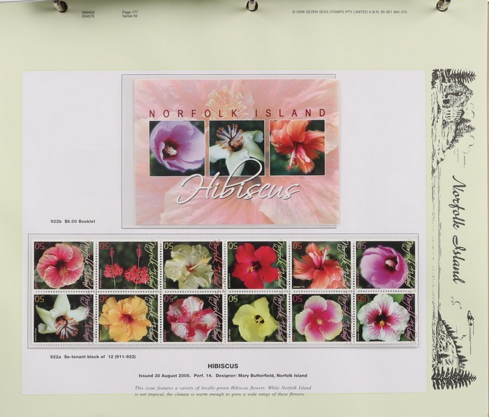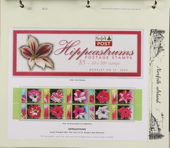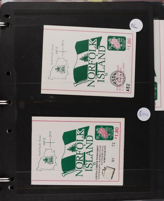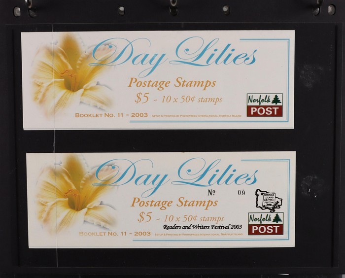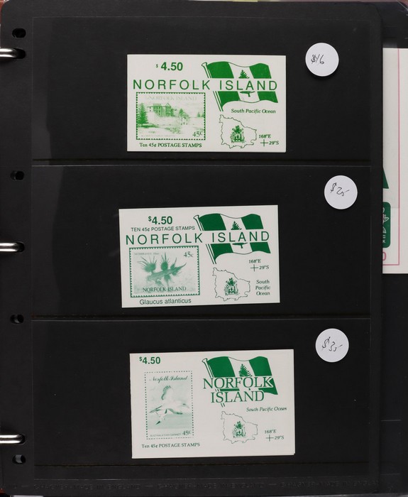 930 imageNorfolk Island booklet collection (47) inc 1991 Ham Radio with gutter, 1995 Flowers (7) inc ASDA opts (3, cat $180) & Bridge Tournament opt ($60), 2002 Fragrance (3) inc Writers & Readers Festival opt 2003 Day Lilies with Readers & Writers Festival opt (cat $100), 2005 Hibiscus (scarce & under-rated), 2009 Bush Birds (2) & 2010 World Heritage. Odd duplicate, all fresh MNH. Pfeffer cat $900. Also 1998-2003 Annual Folders (FV $200) & (2) 1969 Bird Packs (retail $100). (55 items) (Image1) (Image2) (Image3) (Image4) (Image5) (Image6) (Image7) (Image8) (Image9) (Image10) (Image11) (Image12)
