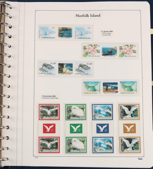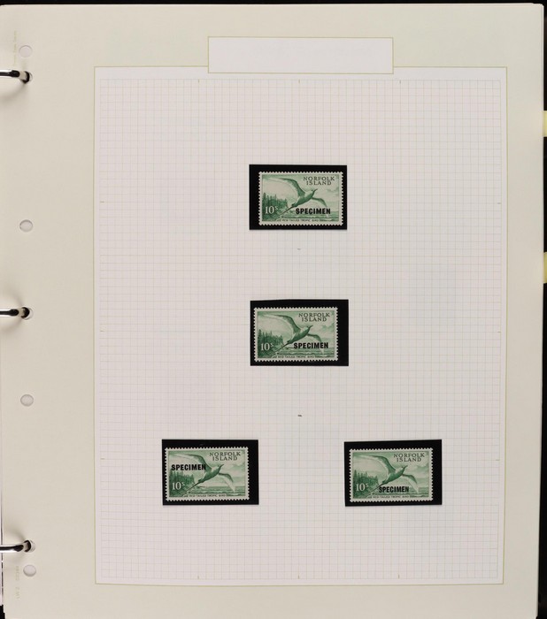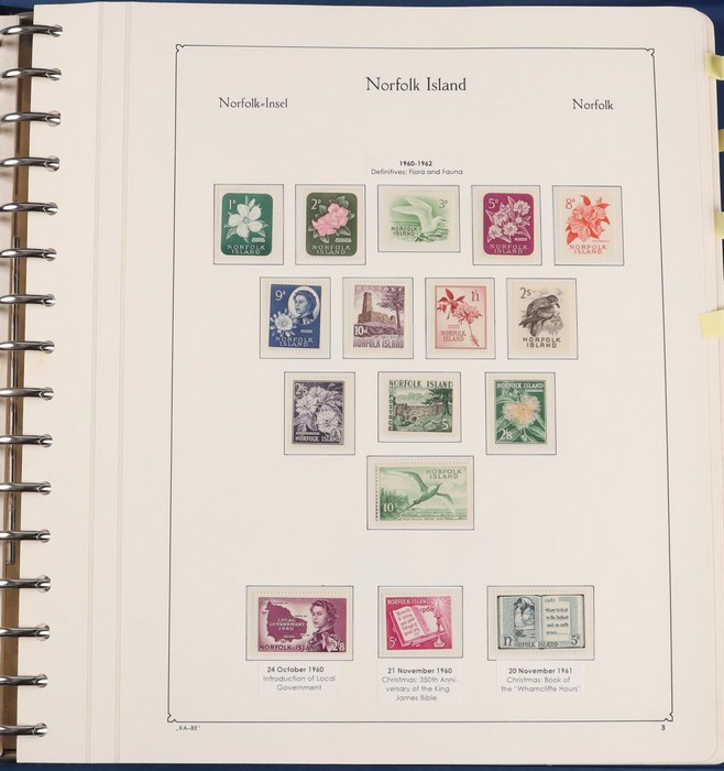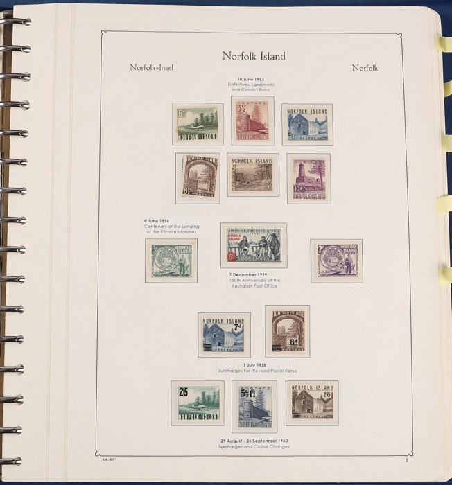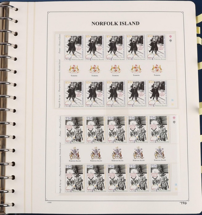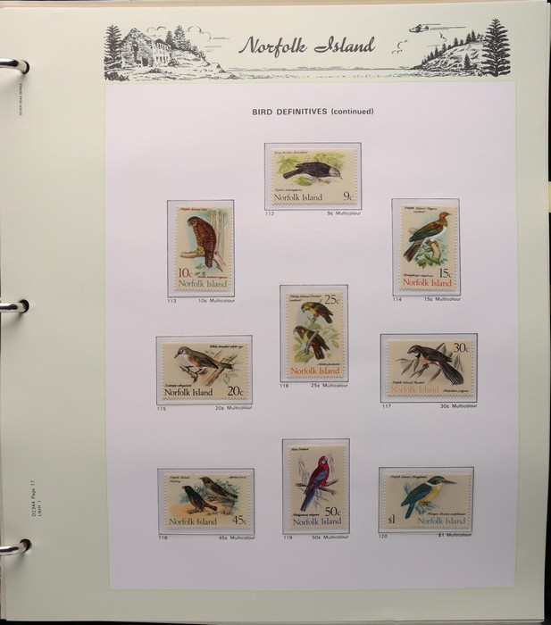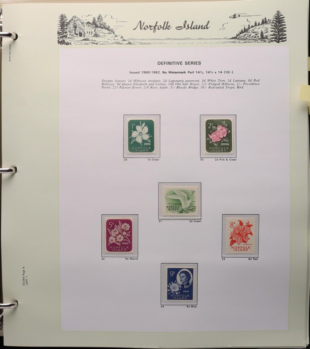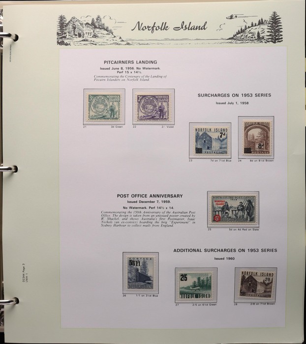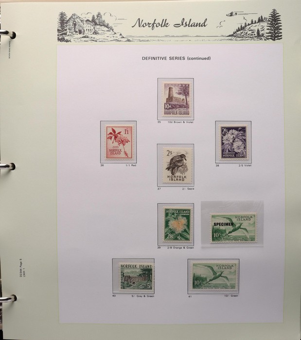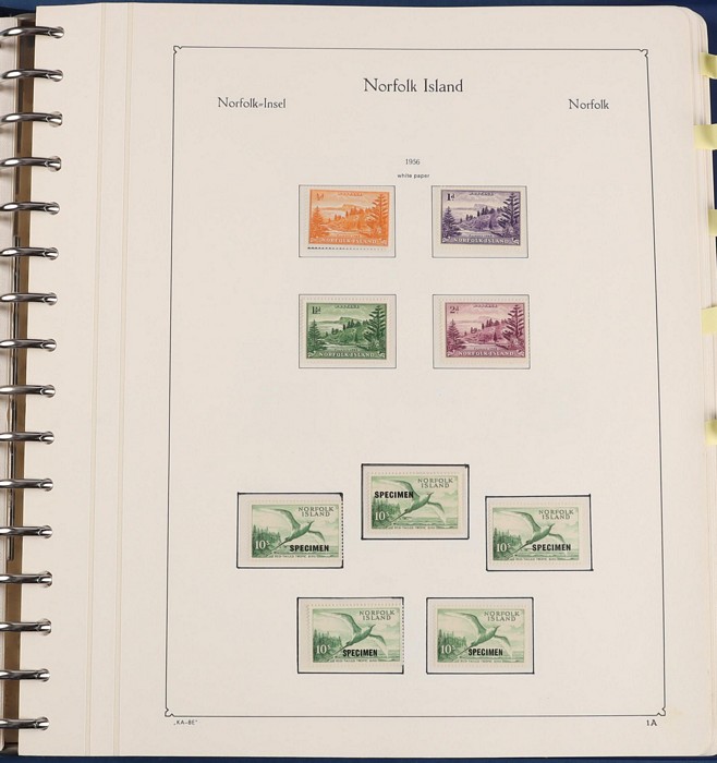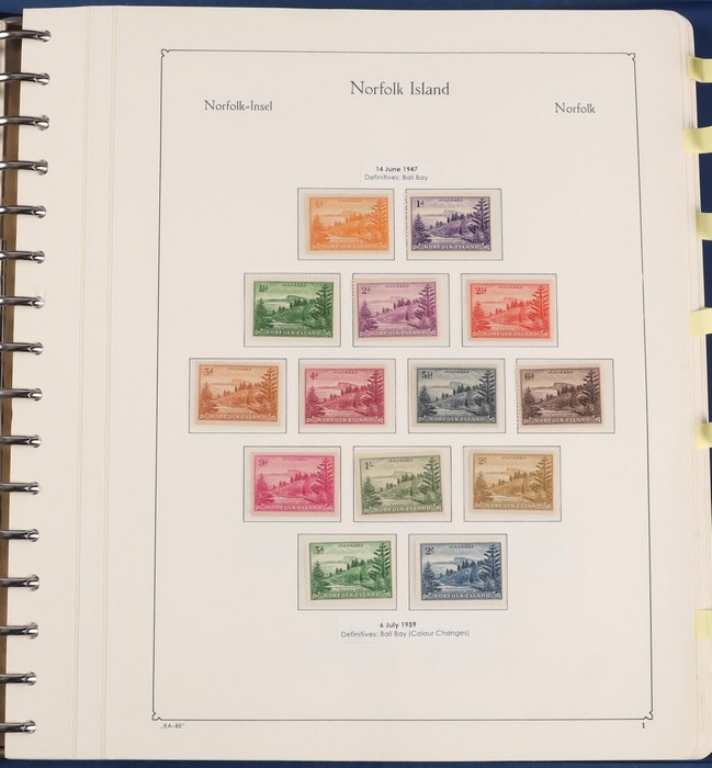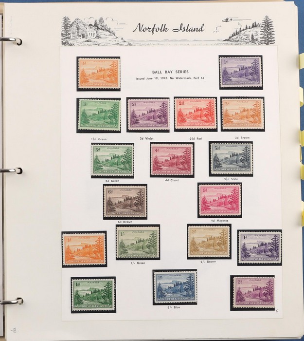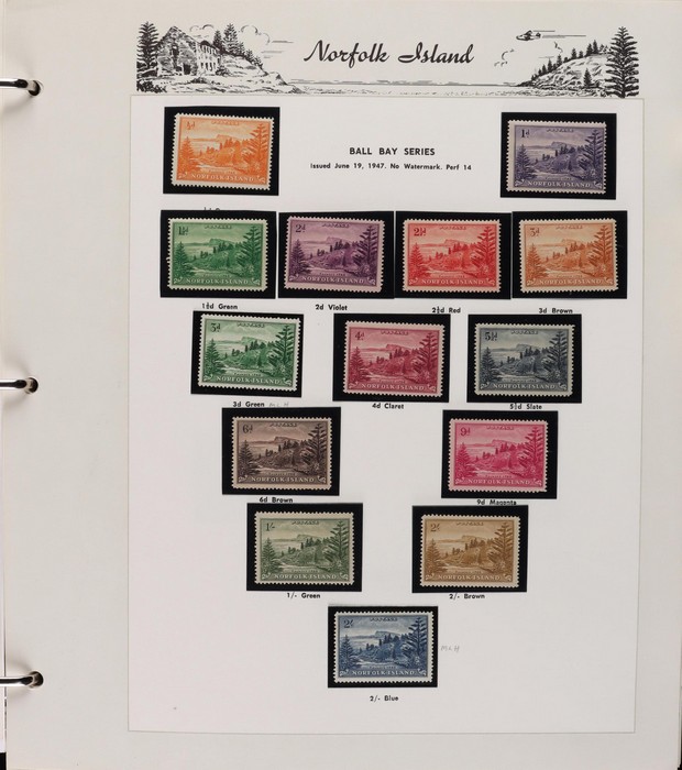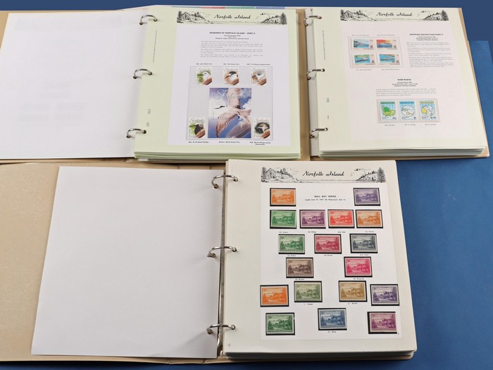931 imageNorfolk Island: 1945-2014 extensive 3 volume MNH collection with 1947 Ball Bay set to 2/- blue, plus white papers ½d, 1d, 1½d, 2d set of 4. 1953 Pics to 5/- brown Bridge, 1960 Defs to 10/- plus SPECIMEN opts (5, retail $350) inc set of 3 diff types. 1960 Local Govt 2/8, 1966 opt set 1967 Ships, 1967 Birds, 1974 UPU M/Sheet. 1989-90 Ships set, 1994 Explorers to $5, 1995 Victory $10, 1995-2004 booklet panes/comp booklets, post millennium era MNH Pictorial gutter blks & multiples plus other optional extras. Mostly fresh MNH, retail $1200 to end 1990 plus $1060 FV 1991-2014 & another $650 for the 3 KABE slipcase hingeless album, total $2360. (P) (Image1) (Image2) (Image3) (Image4) (Image5) (Image6) (Image7) (Image8) (Image9) (Image10) (Image11) (Image12) (Image13) (Image14) (Image15) (Image16) (Image17) (Image18) (Image19) (Image20) (Image21) (Image22) (Image23) (Image24) (Image25) (Image26) (Image27)