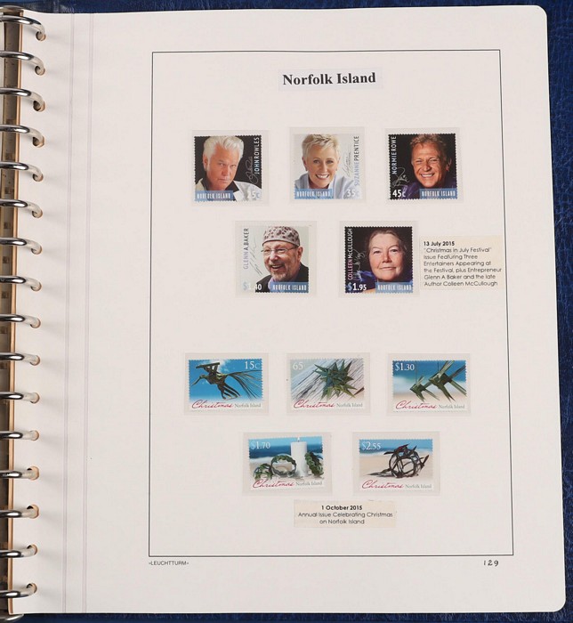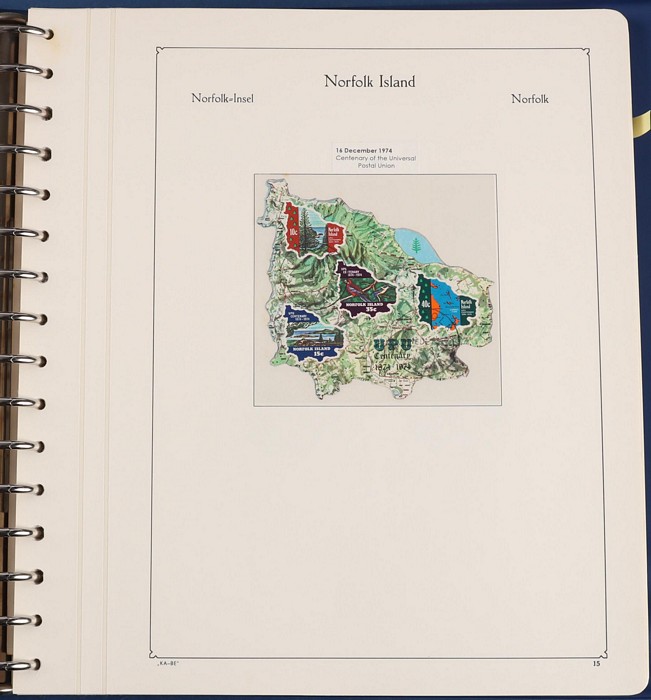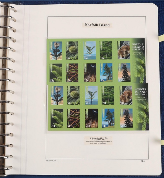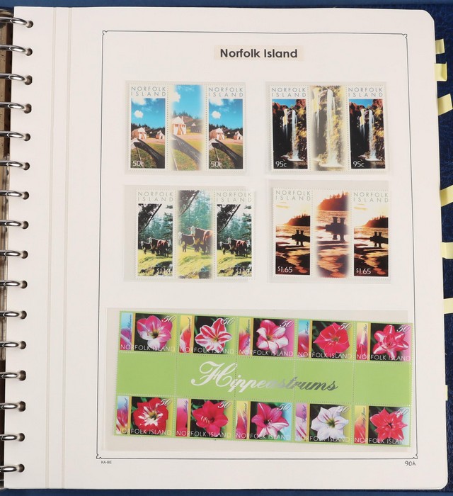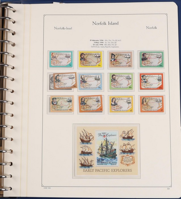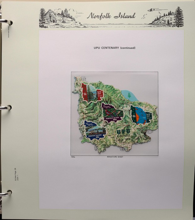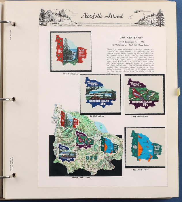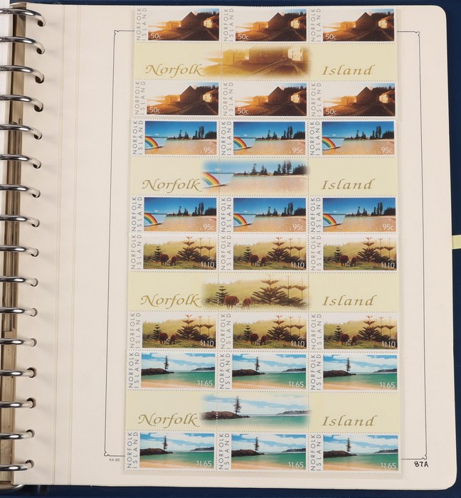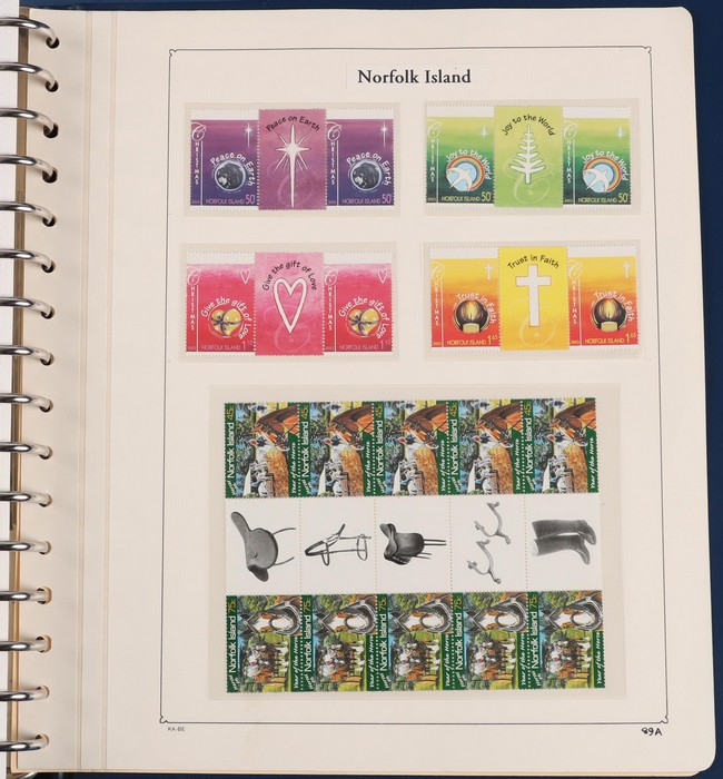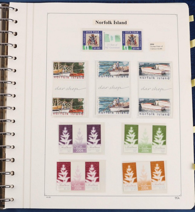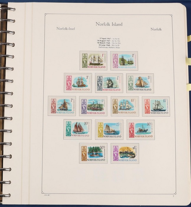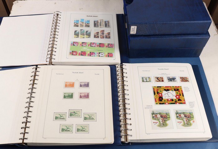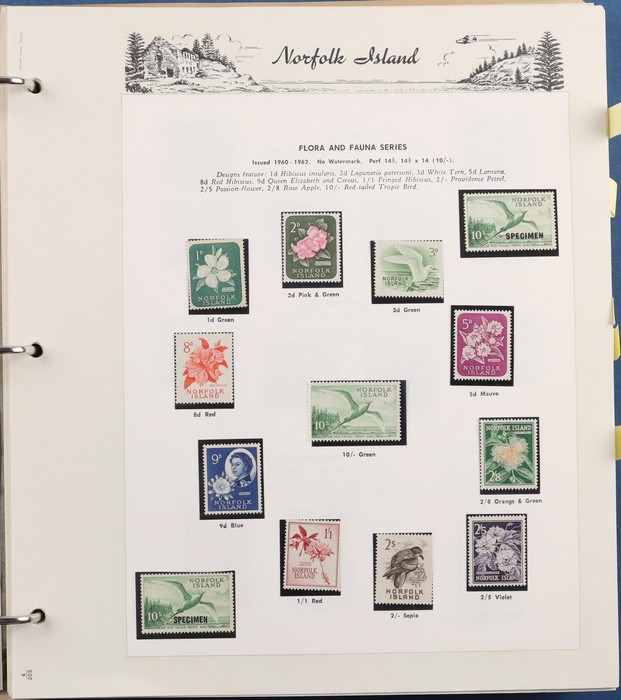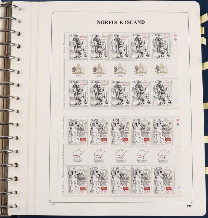 931 imageNorfolk Island: 1945-2014 extensive 3 volume MNH collection with 1947 Ball Bay set to 2/- blue, plus white papers ½d, 1d, 1½d, 2d set of 4. 1953 Pics to 5/- brown Bridge, 1960 Defs to 10/- plus SPECIMEN opts (5, retail $350) inc set of 3 diff types. 1960 Local Govt 2/8, 1966 opt set 1967 Ships, 1967 Birds, 1974 UPU M/Sheet. 1989-90 Ships set, 1994 Explorers to $5, 1995 Victory $10, 1995-2004 booklet panes/comp booklets, post millennium era MNH Pictorial gutter blks & multiples plus other optional extras. Mostly fresh MNH, retail $1200 to end 1990 plus $1060 FV 1991-2014 & another $650 for the 3 KABE slipcase hingeless album, total $2360. (P) (Image1) (Image2) (Image3) (Image4) (Image5) (Image6) (Image7) (Image8) (Image9) (Image10) (Image11) (Image12) (Image13) (Image14) (Image15) (Image16) (Image17) (Image18) (Image19) (Image20) (Image21) (Image22) (Image23) (Image24) (Image25) (Image26) (Image27)
